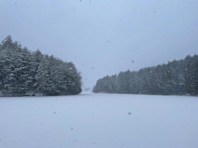 But now that the transition to quiet of this place is so much more pronounced, I wonder if it takes me longer to adjust. To listen for the sounds under the silence. I know there’s an acclimatizing period because my eyes go through it too. Get tricked early and often in the first few days, snagged by what looks like movement against the clean blanket of white only to see it was a branch swaying, dipping, usually from the wind but sometimes, tracing up the trunk, finding a bird or red squirrel busy high above. The movement, the life, also gets hidden under all the stillness.