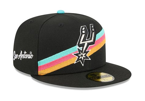 Must the Spurs have everything? A perfect hat, the sharpest jerseys in the league, PLUS one of the Signs aliens who plays like Pistol Pete crossed with Dr. Octopus. The big chunky spur looks great, the “fiesta” stripe makes it pop off the panel, smiling through it all, can’t believe this my life.