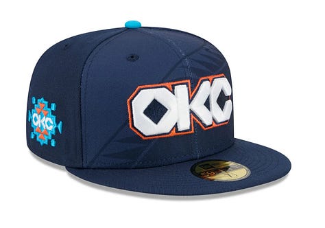 When Clay Bennett bought the Seattle Supersonics, he visited a witch who granted him his wish to move the team and build a potential dynasty in Oklahoma. What Bennett didn’t realize was that, in exchange, his team would be cursed to always look like shit playing in the most ill-conceived, aesthetically incoherent uniforms in the league. This busy hat, which pays tribute to OK’s indigenous tribes, is about as good as it gets.