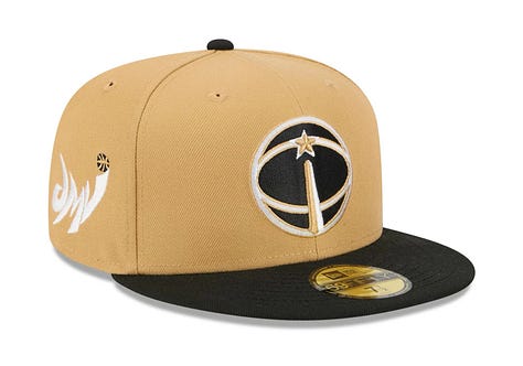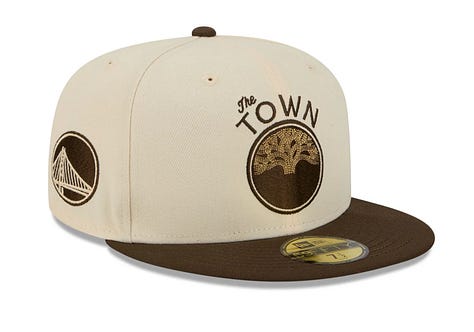 The Town. The Town is Brown. On the Crown, the Town is Brown. The Warriors left (betrayed?) Oakland in 2019, having won three of their four Curry Dynasty championships there. They won once more in the bosom of the Silicon Valley tech overlords, but the empire is now in decline. So it makes sense that they’d return to this Oakland-centric design to take one last run at glory. Disingenuous or not, this hat is hard as hell.