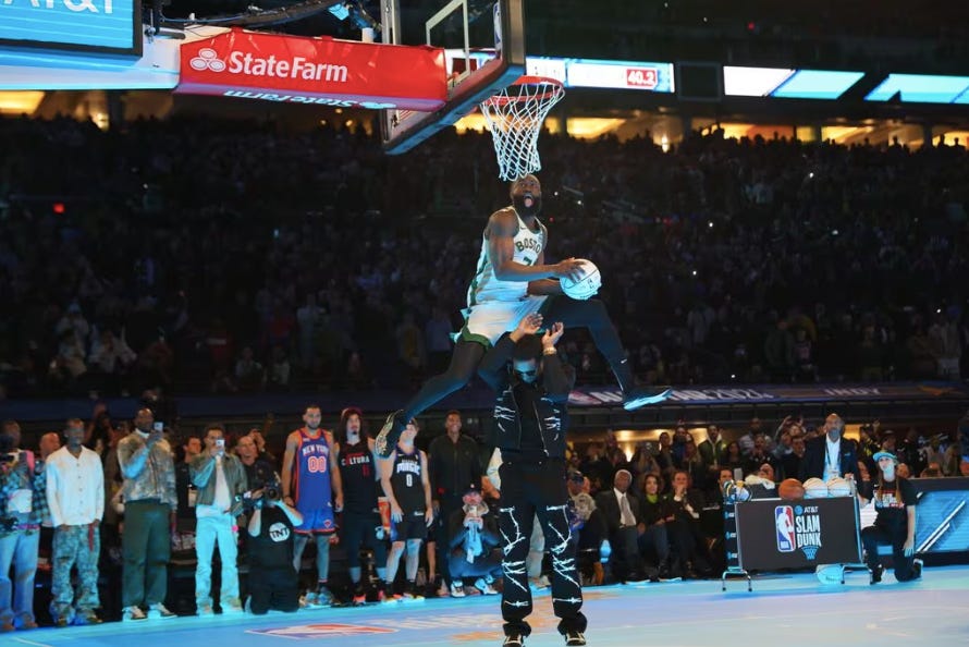 Jaylen Brown was trying so hard. Performance in the Dunk Contest is the same as performance reliant on a live audience in any medium. Effort cannot be picked up on unless it’s in retrospect. To think how hard a comedian made you laugh while it seemed they were hardly trying, to think how easy an athlete makes a dunk look. The former easier than the latter to picture yourself doing, for most people, but that’s the ruse. The buy-in. The problem was that everyone knew he was the Capital S Star from the start, that he was meant to prove why that mattered.