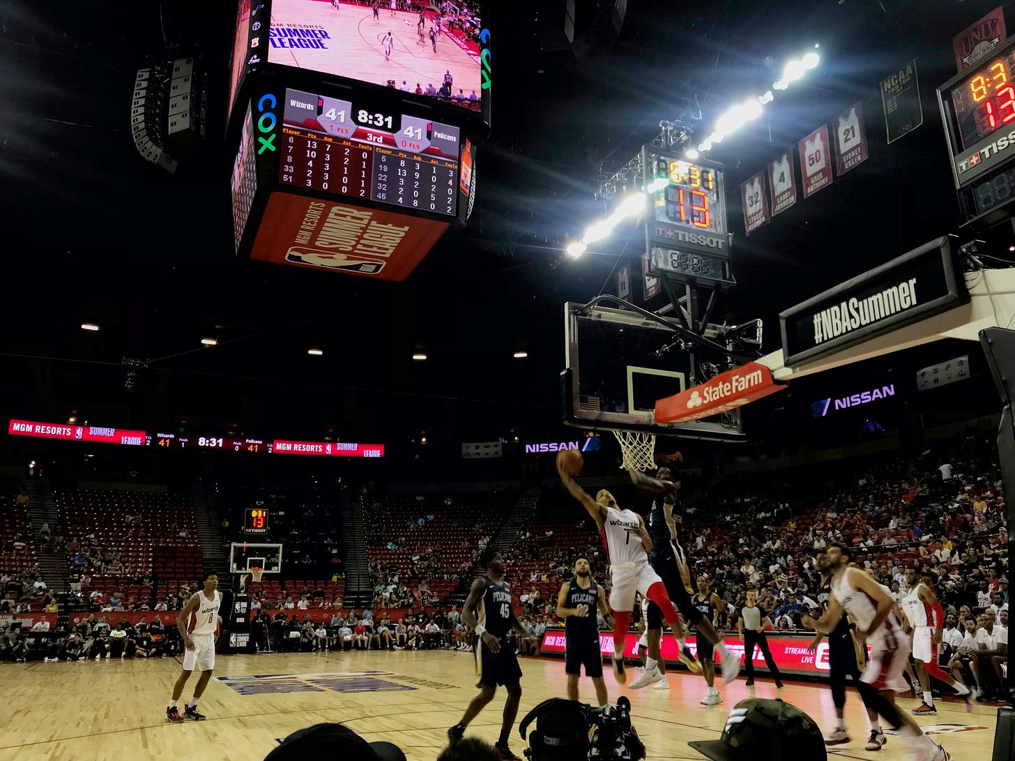 Out in the desert at Summer League, a few long blocks from the strip but far enough that you remember what you forget walking under the glass towers and 24hr sunlight of LEDs, that the only thing here before all this were calico rocks and red-yellow dirt, the dust of it, if there’s enough of a breeze rushing in from the desert around, catching against the sweat at your neck, a gritty little blessing. The air conditioning of Thomas and Mack set to “chest freezer”, goosebumps raising with the temperature as much as to the flinging limbs and splayed legs of chaotic basketball. How it felt to spill out into the night coming on, trying to adjust your breathing quick as you can from circulated air to air so dry it’s seizing, heat radiating up off the parking lot and sky all around hanging a gauzy, drifting purple, the last desperate light from the sun falling behind the distant La Madre mountains edging them in gold. Standing by yourself surrounded by so many people and rendered alone for a few dizzy seconds by the sprawl of the sky and air that wants to wring you all the way out.