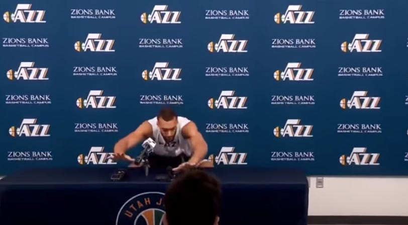 Updates from beat reporters milling in empty tunnels that a testing team had arrived and been hustled into the Jazz locker room. Updates from the Jazz that Rudy had been tested that morning for influenza, strep throat, upper respiratory infection, that he felt “fine”. If you were watching you already knew where it was headed, where this night was going to collide into the larger story creeping border to border, over oceans. But if you were like me, when you heard, when the NBA released the memo, you were still like, “But Rudy? Really, Rudy?”