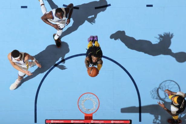 I think of Morant’s legs every time he leaves the earth. Not in how they get him there, there are certain mysteries I’m fine taking at face value, but in how ravenous the impact of coming back down can be. That and they are long, and there are times when you can see the brunt of force at landing buffet up them heel to hip, the crude jealousy of physics clinging like a scorned lover looking to make up for stolen time.