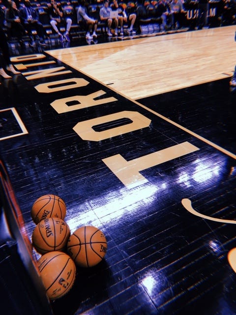 I keep thinking about the high shine of a court when I do it. How overhead stadium light on hardwood will bleed the court lines out, erase them. Hear the shrieks of sneakers pivoting on a line, a little too late, a body gone hurtling out of bounds into the tense laps of people in the first row. How many moments of easy erasure can happen in a game. How many games seem forgone conclusions, hopeless, run away with, dominated, until the lines blur. A shot comes from deep down at half court, the ball lurches for a second on what feels like the collective intake of breath, sinks and the distance between two numbers suddenly cinches. A player gets a hot hand, a player loses their focus, a player suddenly gets it in their head that they aren’t going to ease off this one.