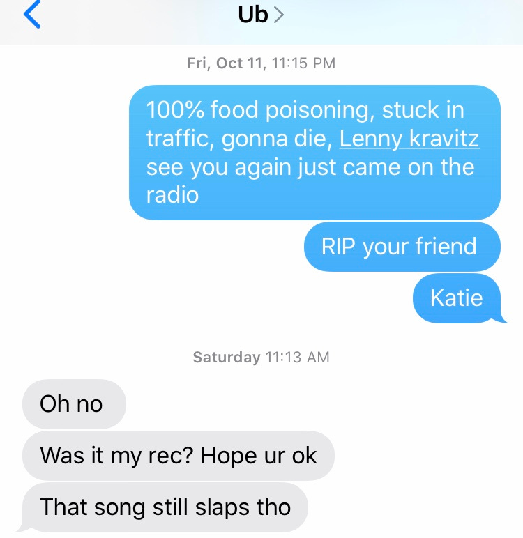 Walking to Rosetta in a torrential downpour, trying to focus on the menu as whatever took hold of me for 24hrs was about to, climbing into a car back to the apartment with Lenny Kravitz blasting and texting Yusef to tell him maybe it was the bullfighting bar he recommended us that did it but also, how cruel it was to hear ‘Again’ and not be able to laugh.