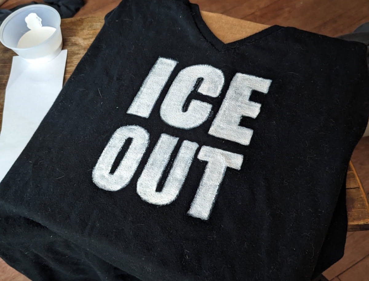 On Sunday I call a friend who is a former graffiti artist. He says yes, he’d be happy to help; no payment necessary. It seems like everybody in Minneapolis wants to throw down against ICE in whatever way they can. It’s inspiring. My friend hand-makes an awesome black t-shirt with a big, clear message: “ICE OUT.” Beautiful work.