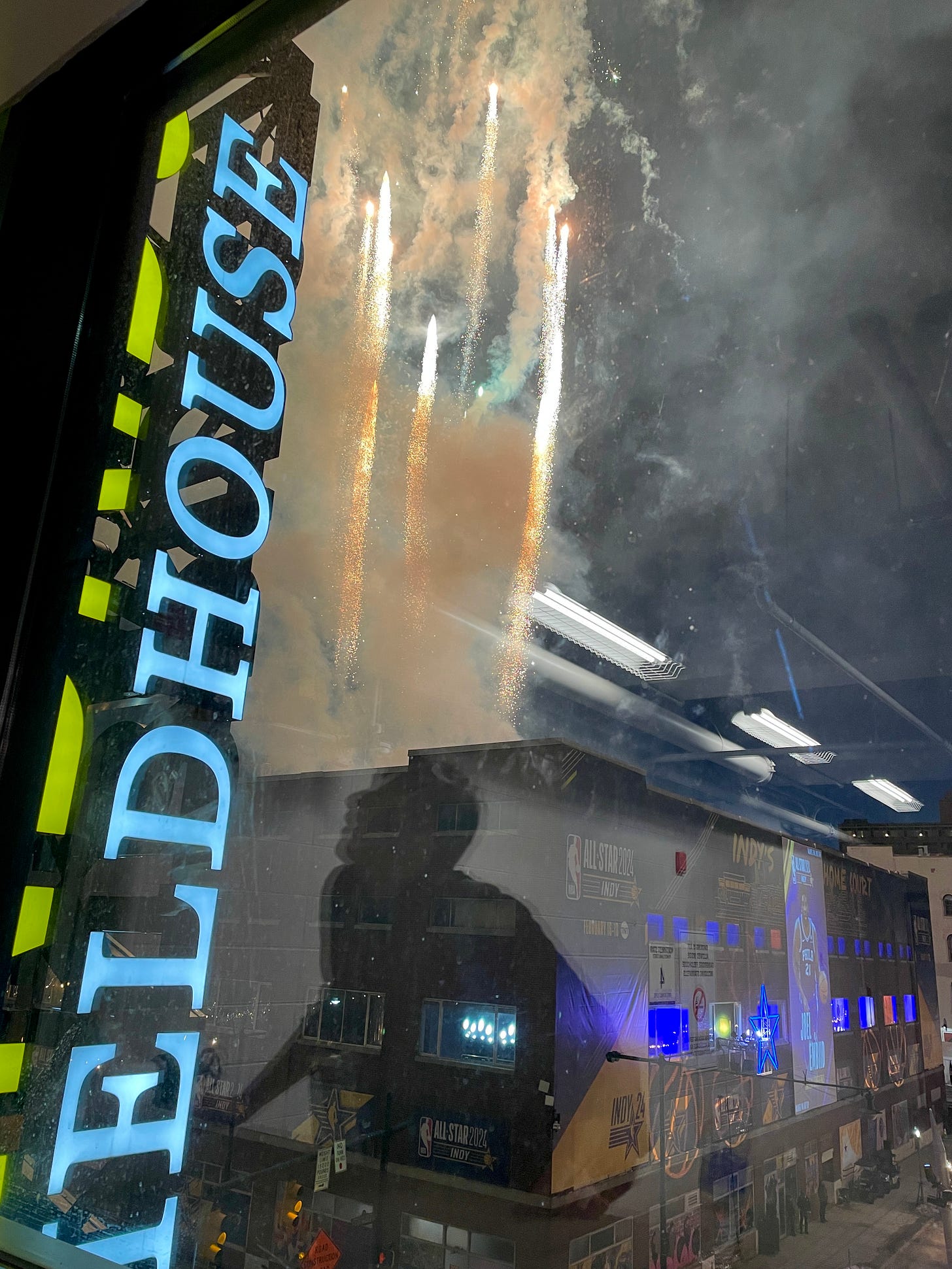 The three-wide staircase narrows to one, single-file, and we take it up. At the top, a small landing and locked doors. As he considers the doors and my eyes drift over to the giant windows running from the ceiling down several levels through the stairwell, fireworks start to shoot up from the roof of the building adjacent.