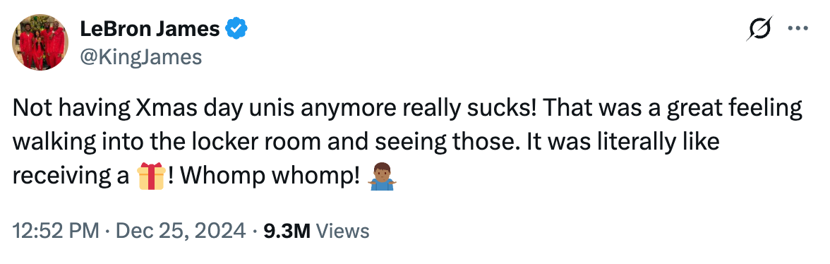 After that… nothing. Nike became the league’s official outfitter in 2017, and Christmas hasn’t been the same since. It’s not just me, either. In 2024, the very face of Nike basketball, LeBron James, posted the following on X: