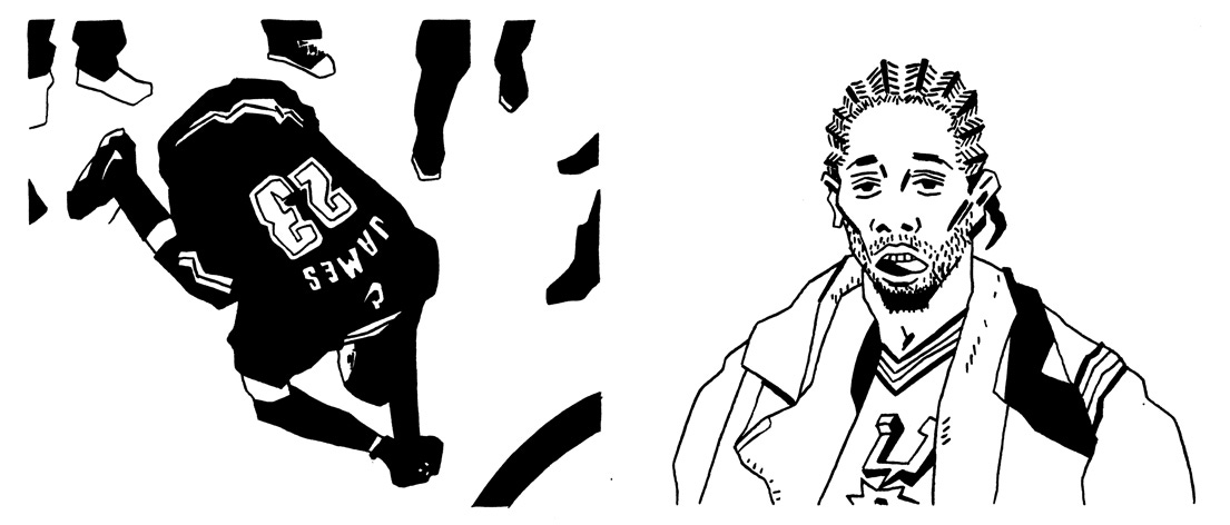 I’ve had the exhilarating and unsettling feeling of Griffen climbing inside my brain to illustrate with precision, care and astonishing accuracy the strangest things I’ve written for five years. It started with The Classical (RIP). I wrote NBA fanfic in general (Paul Pierce is a vampire who misses the team bus and has to fly as a bat to a game in Sacramento from L.A., Chuck Hayes gets lost in a chuckwagon in the wilds of Texas and is accosted by Matt Barnes and the Plumlees as outlaws) and then later as annual Halloween stories (Phil Jackson takes apart the bodies of superstars to create his own horrific Dunkenstein), and Griffen gamely brought each one to life. But please make no mistake, he is a talented artist first, illustrator of weird NBA stories second.