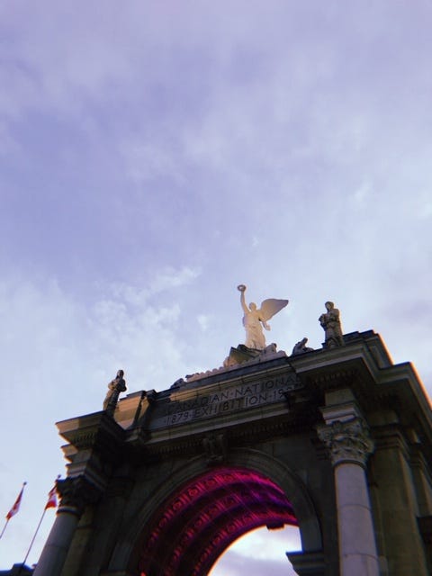 There’s a statue called the Goddess of Winged Victory on top of the Princes’ Gate, a big stone archway that marks the entrance to Exhibition Place in Toronto. She was based on a similar statue, The Winged Victory of Samothrace, or, basically Nike. That statue, the original, is a headless and armless woman about to be, or mid, flight. The one on top of the Princes’ Gate (I have always thought, until right now, it was called the Princess Gates) has her head and arms intact, and is holding up a laurel wreath in triumph and is usually inviting people who live in Toronto into the screaming midway of the Canadian National Exhibition, a yearly—city version of a state fair? Carnival?—18-day long lead up to Labour Day and what essentially marks the end of summer in the city.